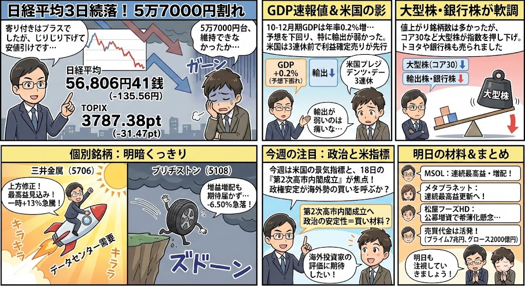 | 日経平均株価 | 56,806.41円 | 📉 -135.56円 | 3日続落。5.7万円維持できず |
