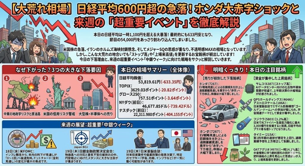 しかし、こんな大荒れの地合いでも「ストップ高」や「上場来高値」を更新するお宝銘柄が続出しています!今日の下落理由と、来週の超重要イベント「中銀ウィーク」に向けた戦略をサクッと解説していきます。